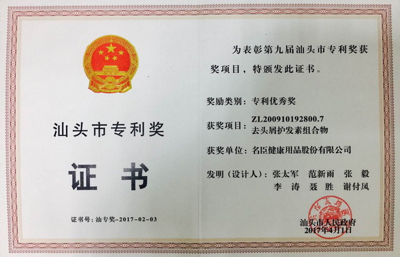 近日,公司发明专利“去头屑护发素组合物”荣获第九届汕头市专利优秀奖。